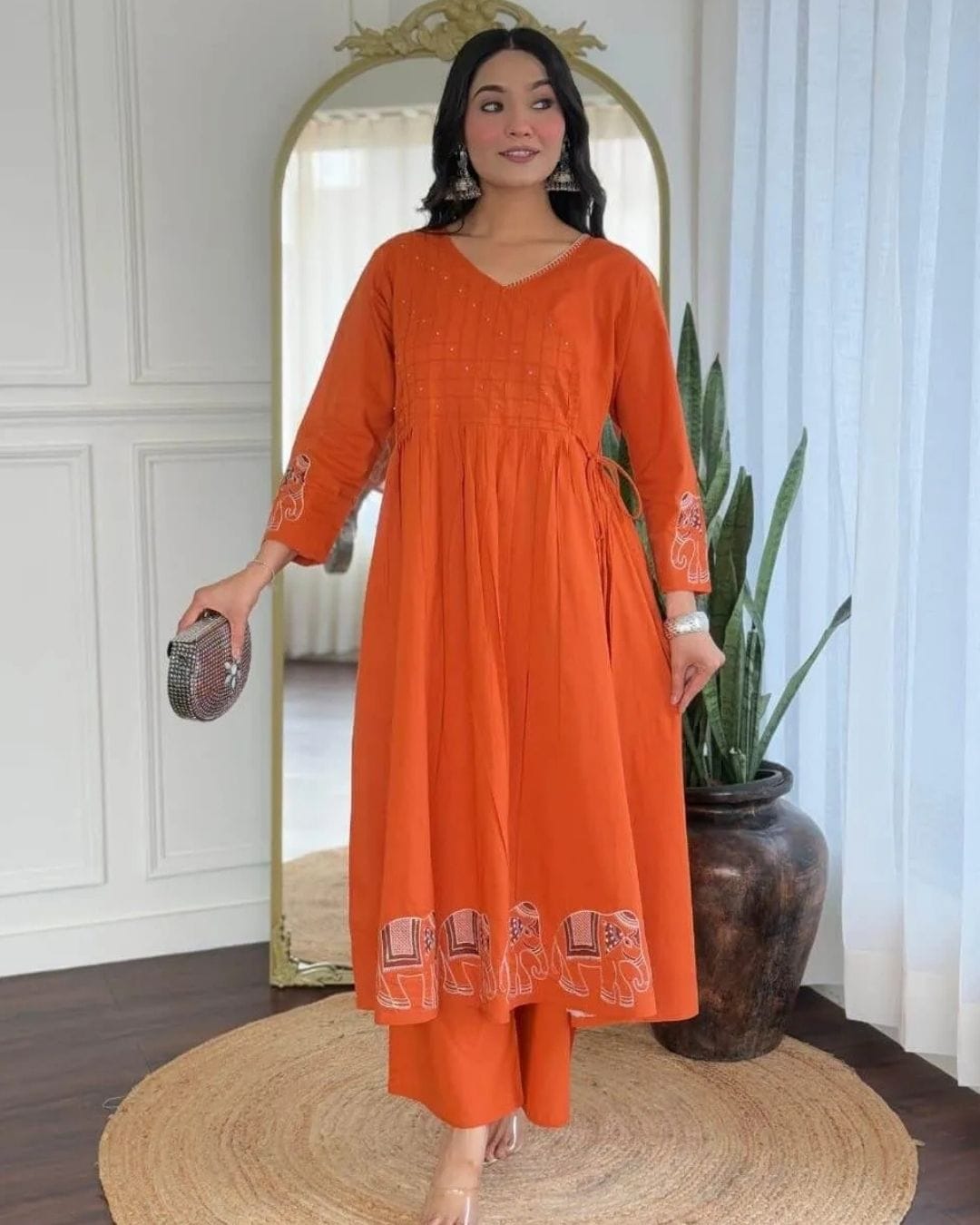Embroidered Elephant Motifs on Hem & Sleeves, Hand Work on Yoke, Tassel Detailing